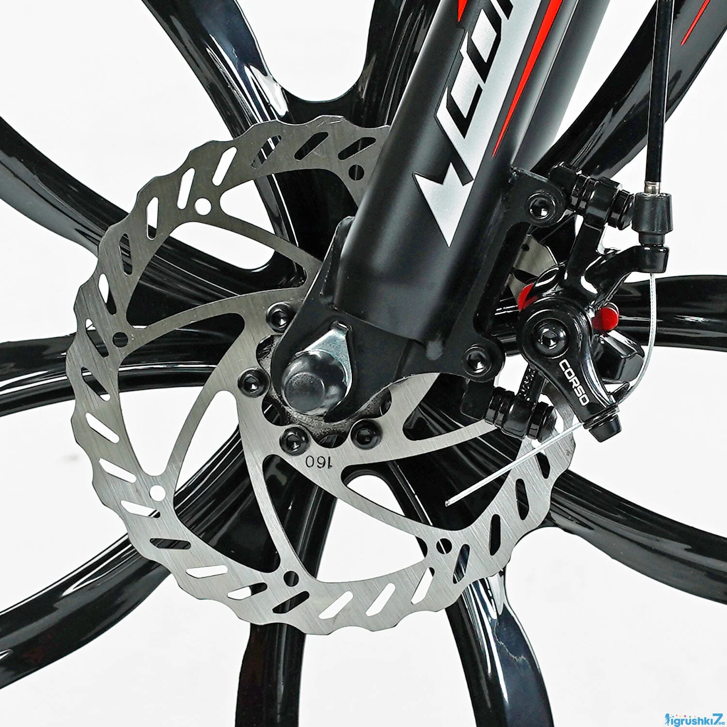 Велосипед Corso “Spider” має алюмінієву раму та амортизаційну вилку з перемикачем, забезпечуючи міцність та адаптацію до різних доріг. Колеса 26 дюймів із протиударними дисками ідеально підходять для спортивної їзди.