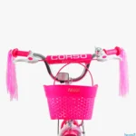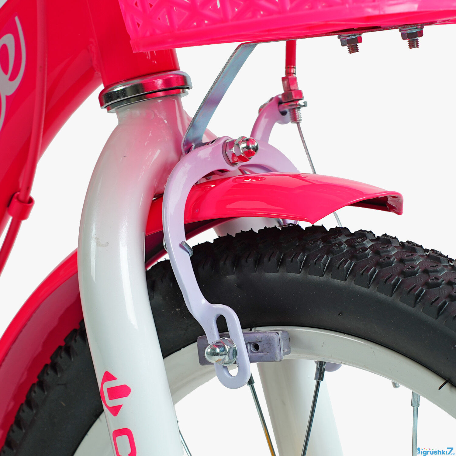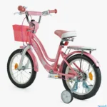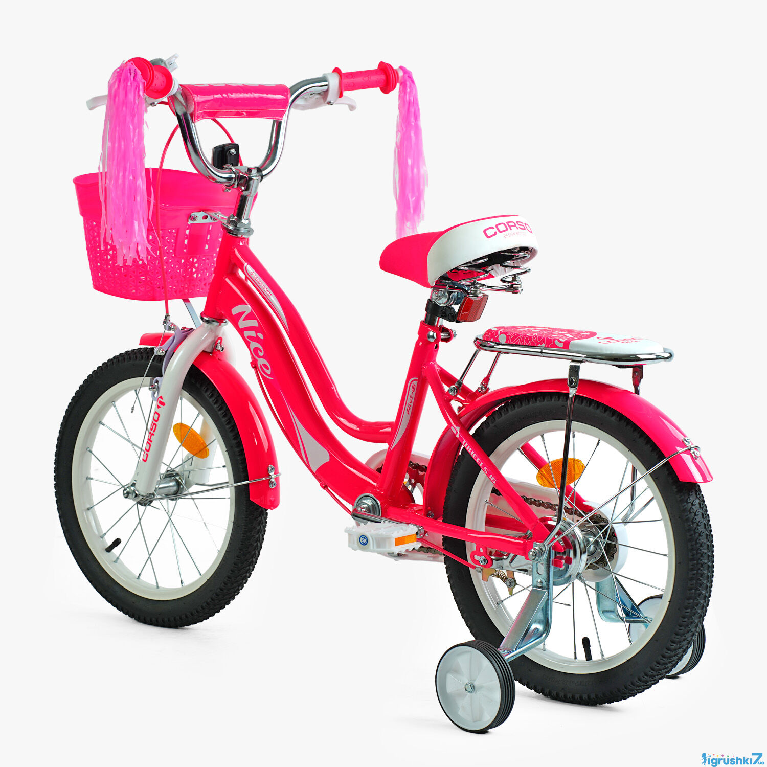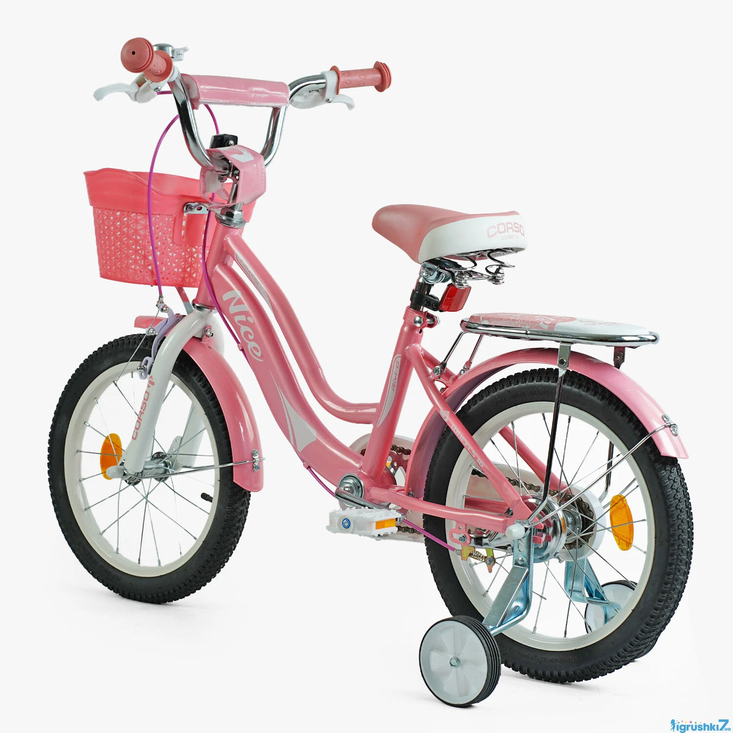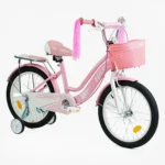 Велосипед має ексклюзивний дизайн з глянцевим фарбуванням, зручні гумові ручки керма та м’яке сидіння з ручкою для додаткового комфорту. До комплекту входять додаткові бічні колеса, дзвіночок, прикраси на кермі, бутилочка, багажник з м’яким сидінням і кошик.