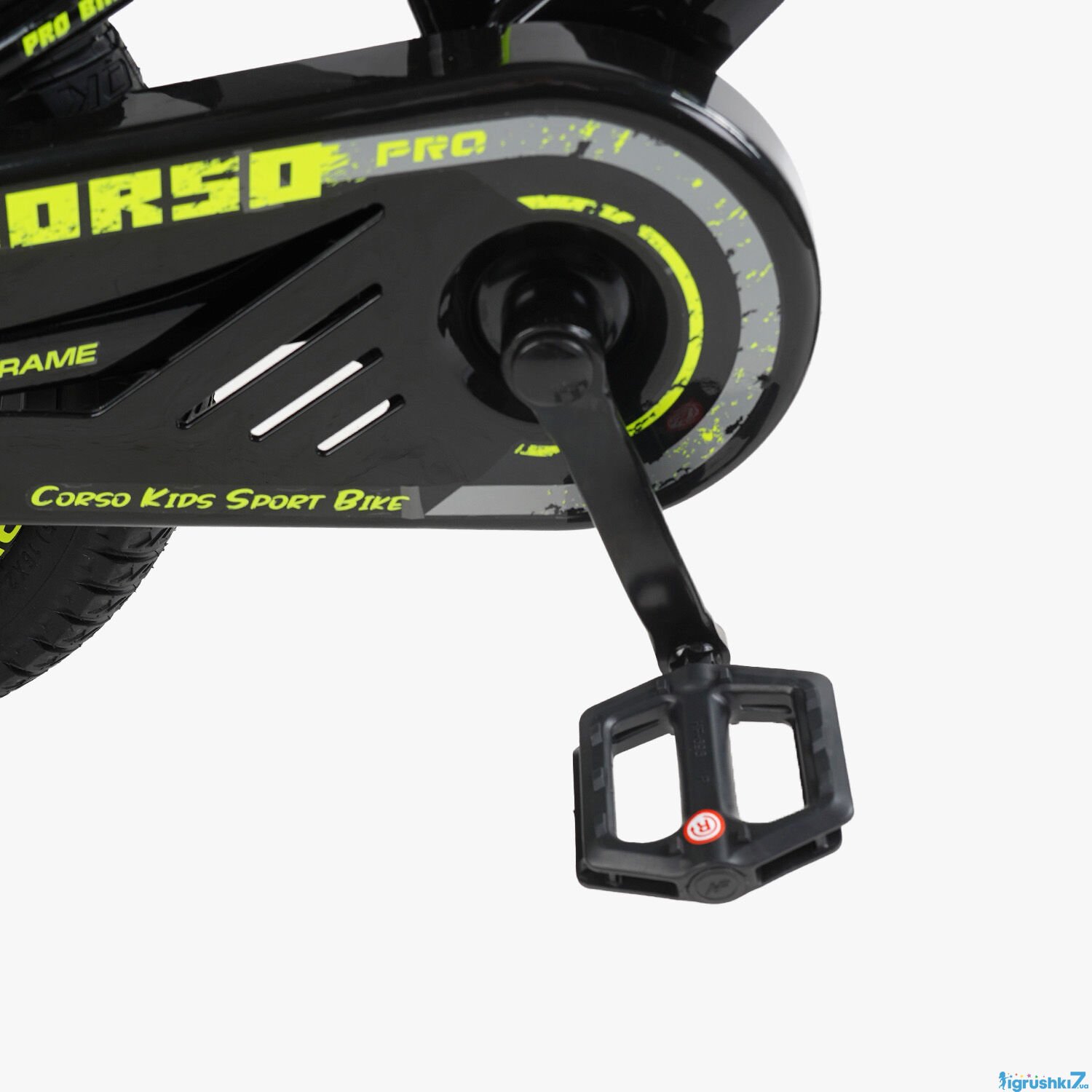 Велосипед оснащений дисковими гальмами спереду та ззаду, м’яким сидінням, якісними грипсами та додатковими бічними колесами — ідеально підходить як для початківців, так і для дітей, які вже впевнено тримають рівновагу.